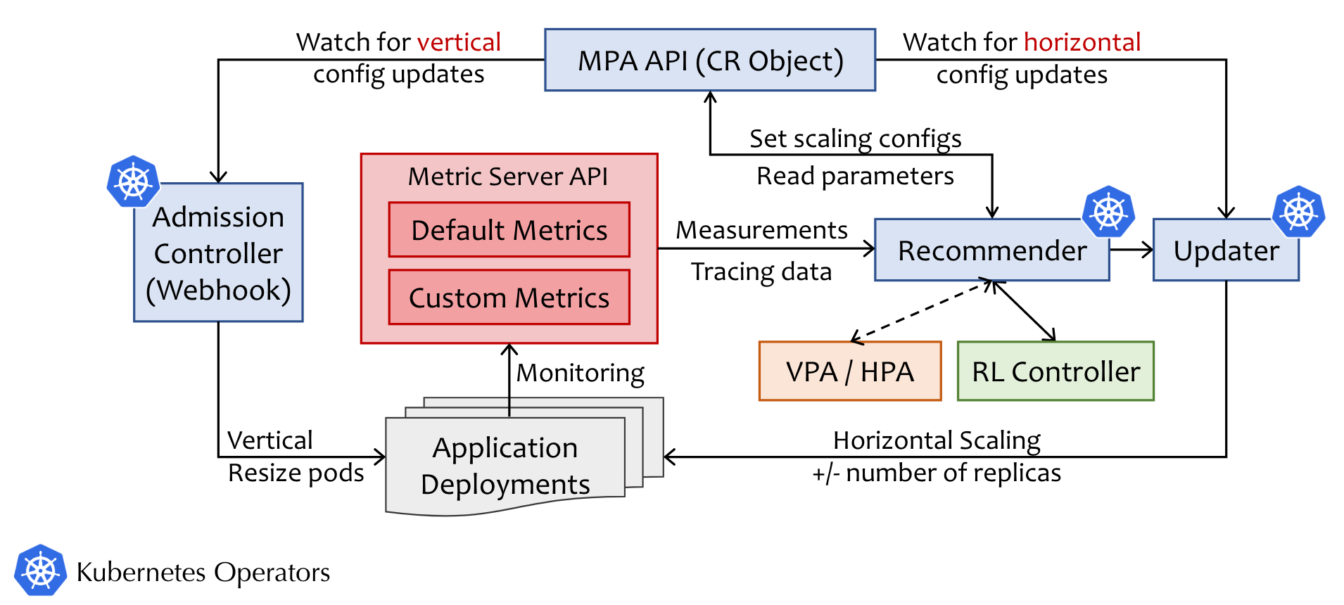 - Recommender从Metric服务器API获取测量值,并获取来自RL控制器或来自非基于RL的控制器的建议,默认情况下VPA和HPA