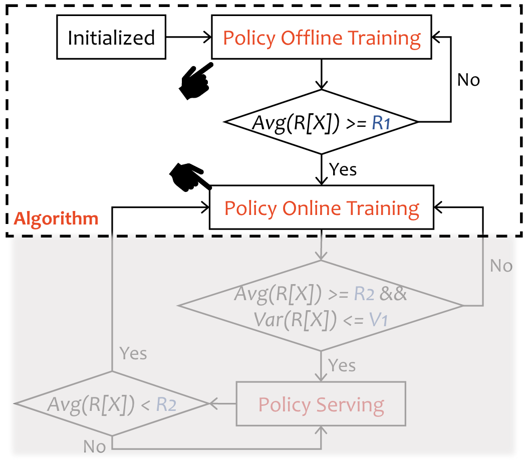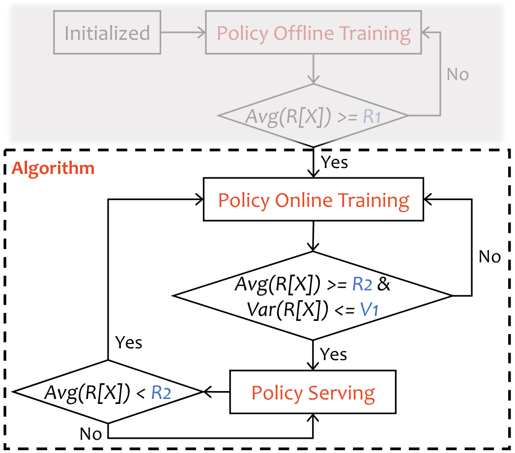 在在线模式下,RL Agent将直接与MPA环境交互。在策略服务和策略训练中,连续观察RL Agent的Reward,然后比较平均值和均方差的阈值。如果奖励波动很大或者平均奖励低于用户指定阈值,表明模型不收敛,会停留在策略训练阶段,重新更新参数。否则RL Agent将继续处于政策服务阶段。
