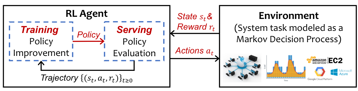 云系统管理任务中充满了连续决策过程,如资源管理、作业调度、拥塞控制。这些问题建模困难,现有的大多数的方法依赖于启发式算法或人工设置规则。 RL(Reinforcement Learning)擅长学习最优策略,它将系统任务建模为一个连续决策问题,并为搜索state-action空间和生成最优策略提供了一个紧密的反馈回路,无需依赖不准确的假设。将 RL 与生产系统中复杂的系统管理任务相结合,可以: