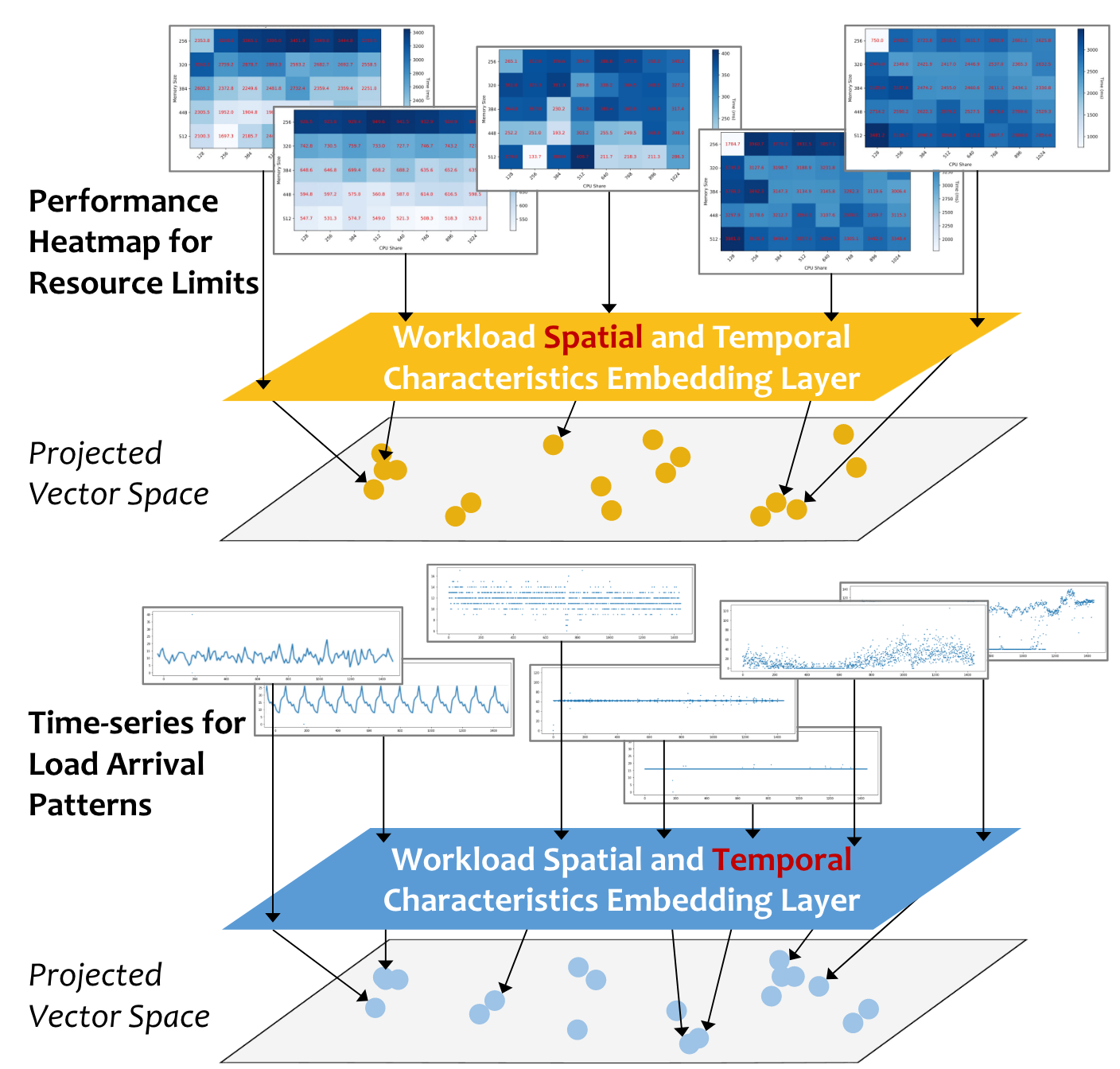 工作负载的空间和时间特征由嵌入层编码并映射到低维潜在向量空间。具有相似特征的工作负载会被投射到该向量空间中彼此接近的位置。通过计算任意两个生成向量(即嵌入)之间的余弦相似度,可以得到一个单调的相似度量。