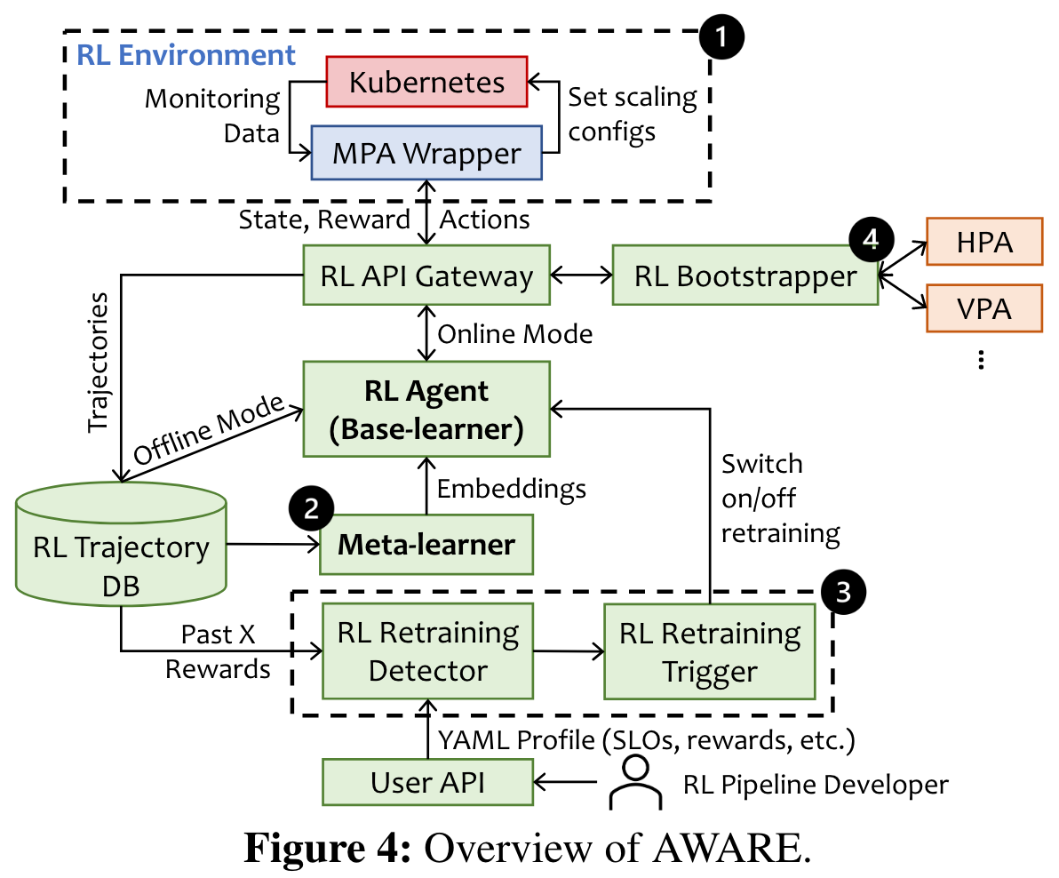 论文中MPA是通过Yaml文件声明创建的,并会生成一个wrapper,交互模式为请求-响应。wrapper通过prometheus查询指标,转换为RL状态和奖励,将接收到的动作转换为垂直、水平缩放配置,写入MPA。此外RL和Meta-learning都是基于python,对平台没有其他要求。 也即是AWARE本身只根据状态和奖励给出动作建议,实际上状态和奖励信息来自于Kubernetes自身的Metric Server,动作建议是通过MPA实现的,因此在我们的平台上应用的可能较高。